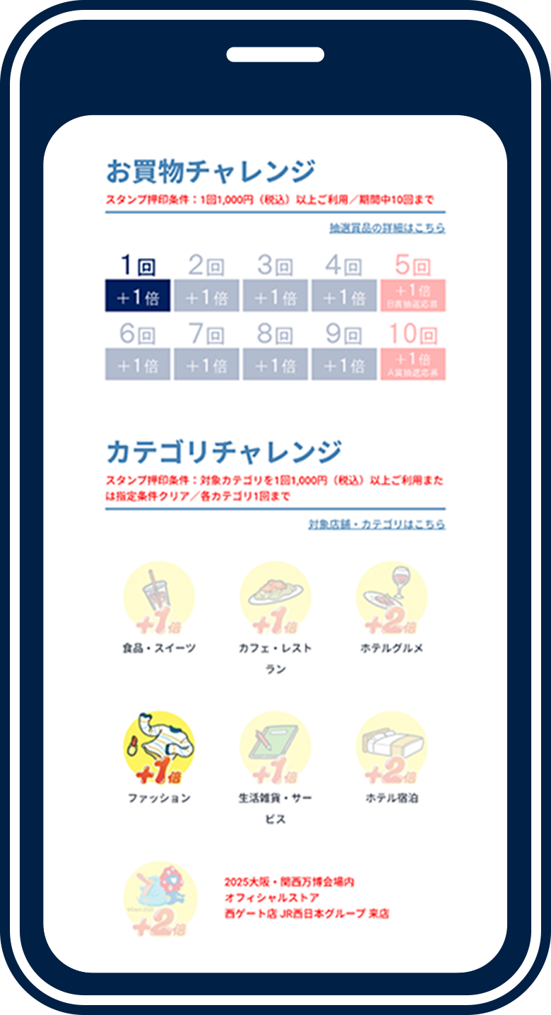 ●通常通りのポイント付与に加えて、該当するカテゴリのご利用(1回あたり1,000円(税込)以上に限る)や条件達成でカテゴリスタンプがたまり、獲得したスタンプの種類によって追加で付与されるWESTERポイント(期間・用途限定)の倍率が加算されます。(食品・スイーツ+1倍、カフェ・レストラン+1倍、ホテルグルメ+2倍、ファッション+1倍、生活雑貨・サービス+1倍、ホテル宿泊+2倍、2025大阪・関西万博会場内オフィシャルストア 西ゲート店 JR西日本グループ ご来店+2倍、最大10倍まで)