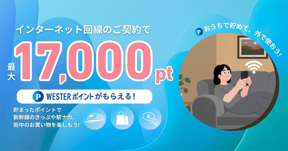 WESTER会員さま限定で、個人向け光回線サービス「USEN光01 WESTER会員限定プラン」をご利用いただくと、①初回契約特典:5,000ポイント(新規開通または転用・事業者変更完了の翌々月末頃に進呈予定)②継続利用特典:毎月 500ポイント(開通した月の3カ月後から、2年間毎月ご利用に対して進呈)