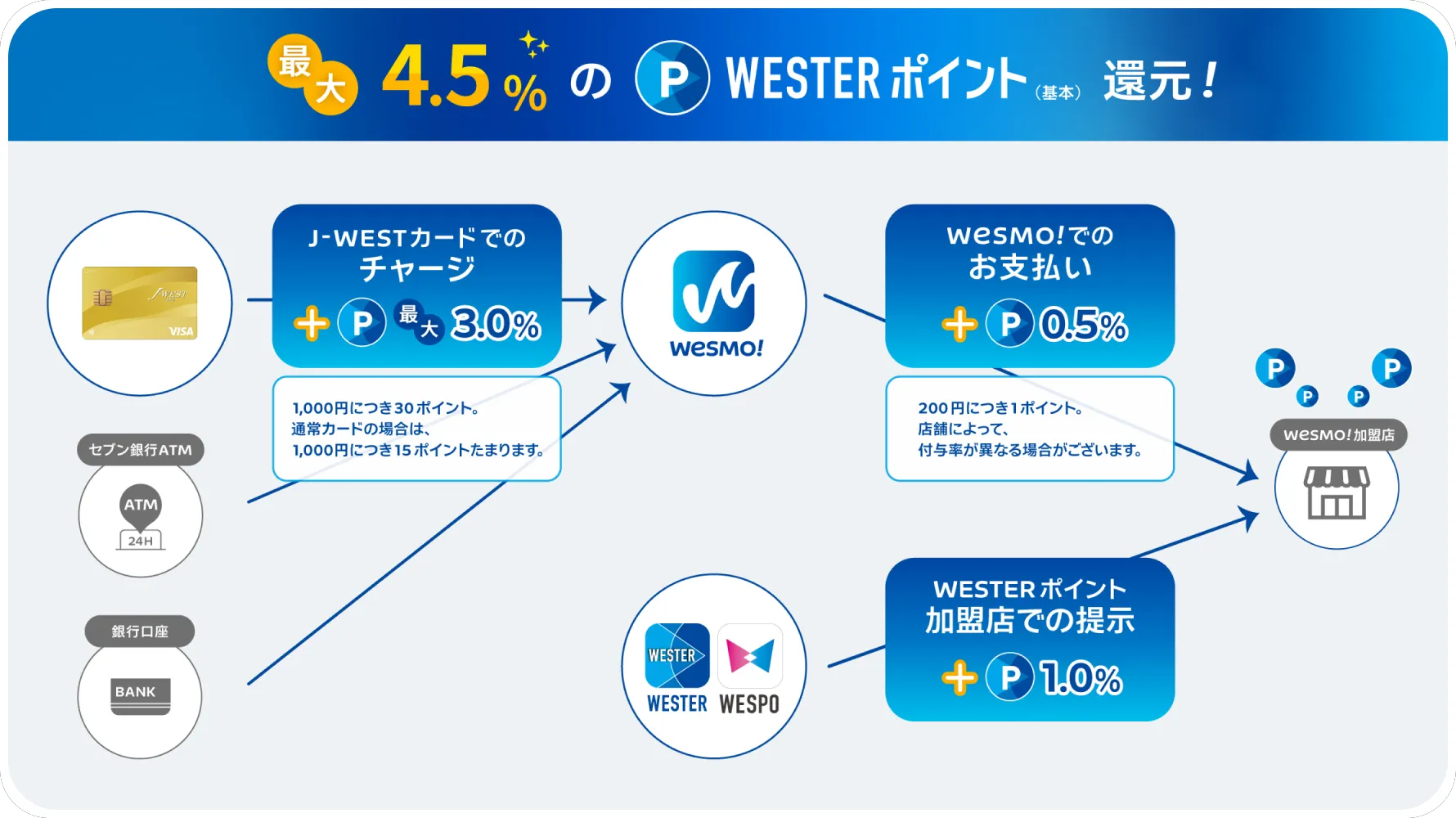 なおWESTERポイント加盟店において、WESTERアプリ、WESPOアプリを提示いただいた場合やJ-WESTカードでのチャージにより、WESMO!決済とは別にWESTERポイントが付与されます。