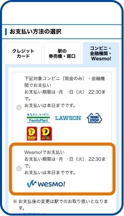 - ※WESMO!で支払うことができるきっぷは「通常のきっぷ、株主優待、障害者割引及び早特商品等一部トクトクきっぷ」です。ポイント利用を伴うきっぷ、チケットレス特急券サービス商品など、一部対象外の商品がございます。