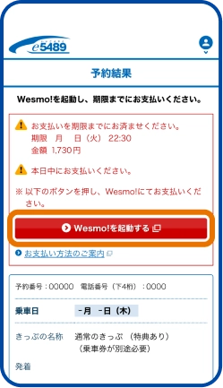 - ※WESMO!で支払う際は、WESMO!アプリをご利用いただいているスマートフォンからe5489にアクセスいただき、ご利用ください。